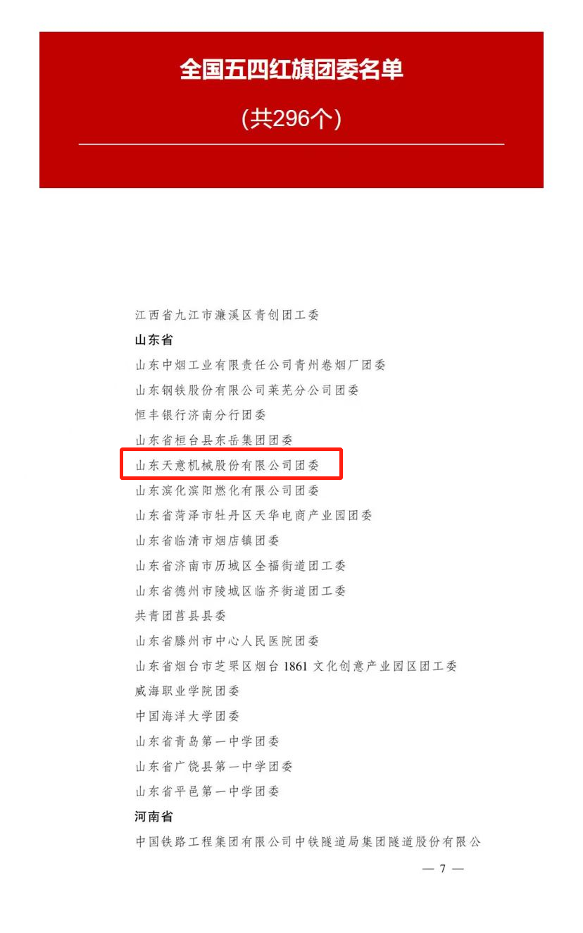 2023年是全面貫徹落實(shí)黨的二十大精神的開局之年。近日,共青團(tuán)中央作出表彰決定,授予296個團(tuán)組織全國五四紅旗團(tuán)委稱號;授予389個團(tuán)組織全國五四紅旗團(tuán)支部稱號;授予481名同志(含追授1名)全國優(yōu)秀共青團(tuán)員稱號;授予342名同志全國優(yōu)秀共青團(tuán)干部稱號。山東天意機(jī)械股份有限公司團(tuán)委榮獲全國五四紅旗團(tuán)委榮譽(yù)稱號。