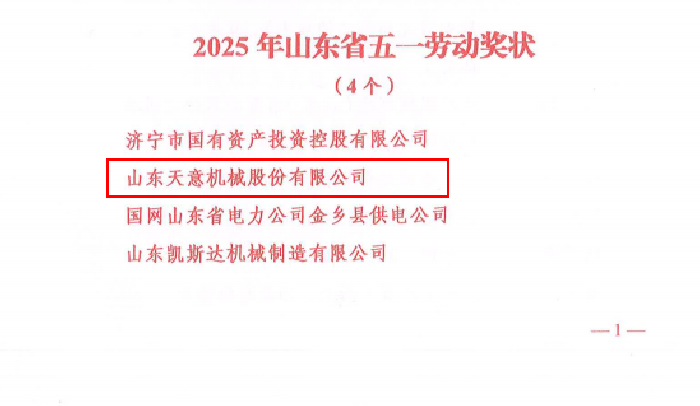 喜報丨熱烈慶祝天意機械榮獲“山東省五一勞動獎狀”